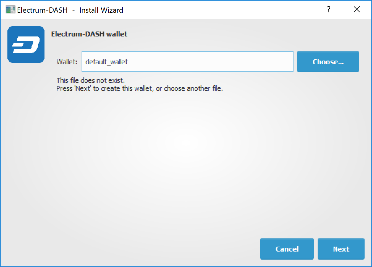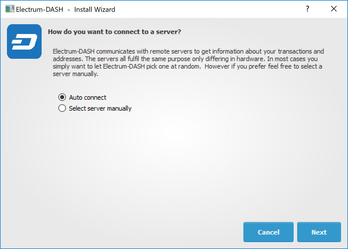 Dash Electrum gathers configuration data when run for the first time. For more on the concepts behind this process, skip to the later sections of this guide discussing backups, security, and addresses. When setting up Dash Electrum for the first time, a wizard will guide you through the process of creating your first wallet. The first screen asks how you would like to connect to the remote server. Select Auto connect and click Next to continue. You will see a notice that no wallet currently exists. Enter a name for your wallet (or accept the default name) and click Next to create your wallet.