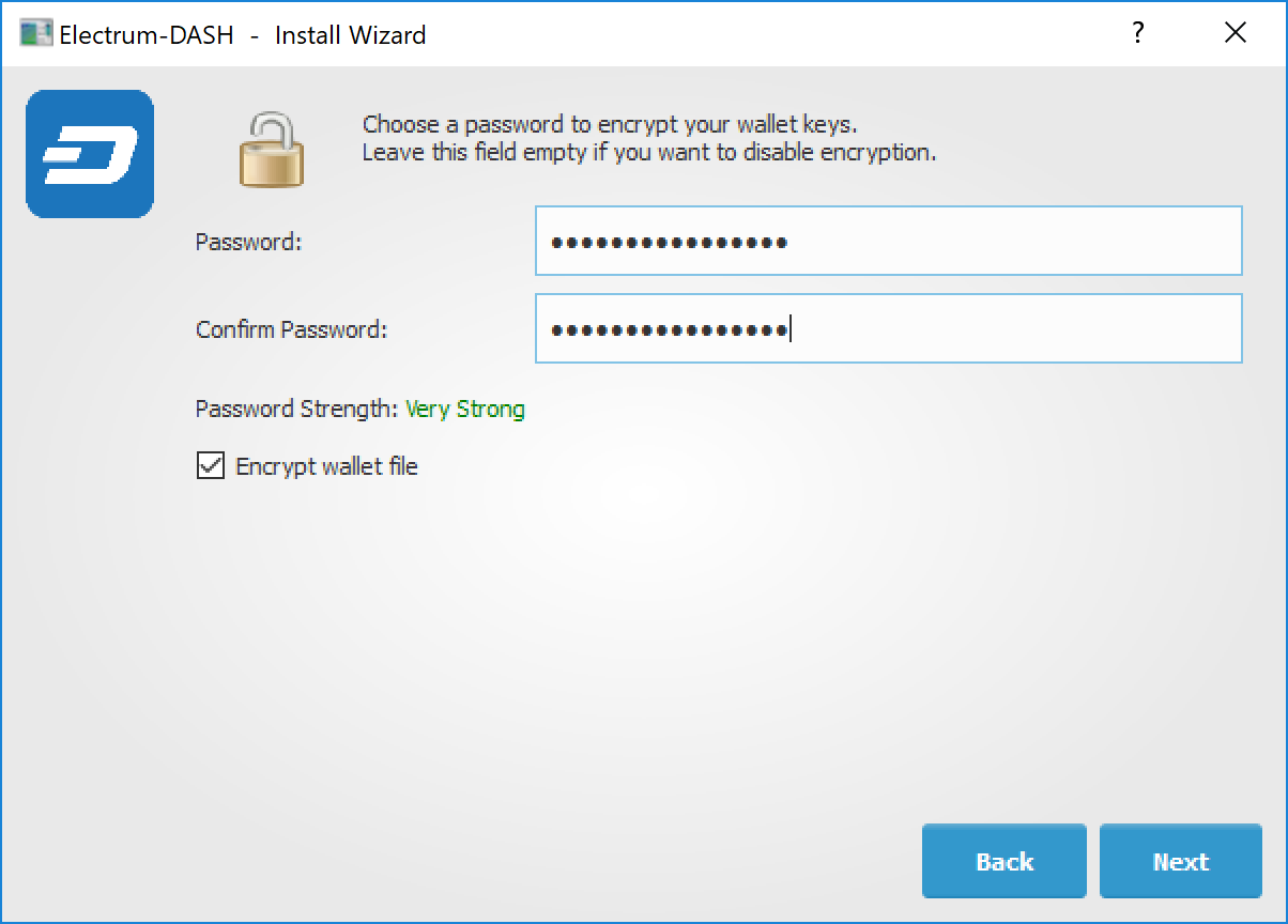 A password optionally secures your wallet against unauthorized access. Adding a memorable, strong password now improves the security of your wallet by encrypting your seed from the beginning. Skipping encryption at this point by not selecting a password risks potential theft of funds later, however unlikely the threat may be. Enter and confirm a password, ensure the Encrypt wallet file checkbox is ticked and click Next to continue.