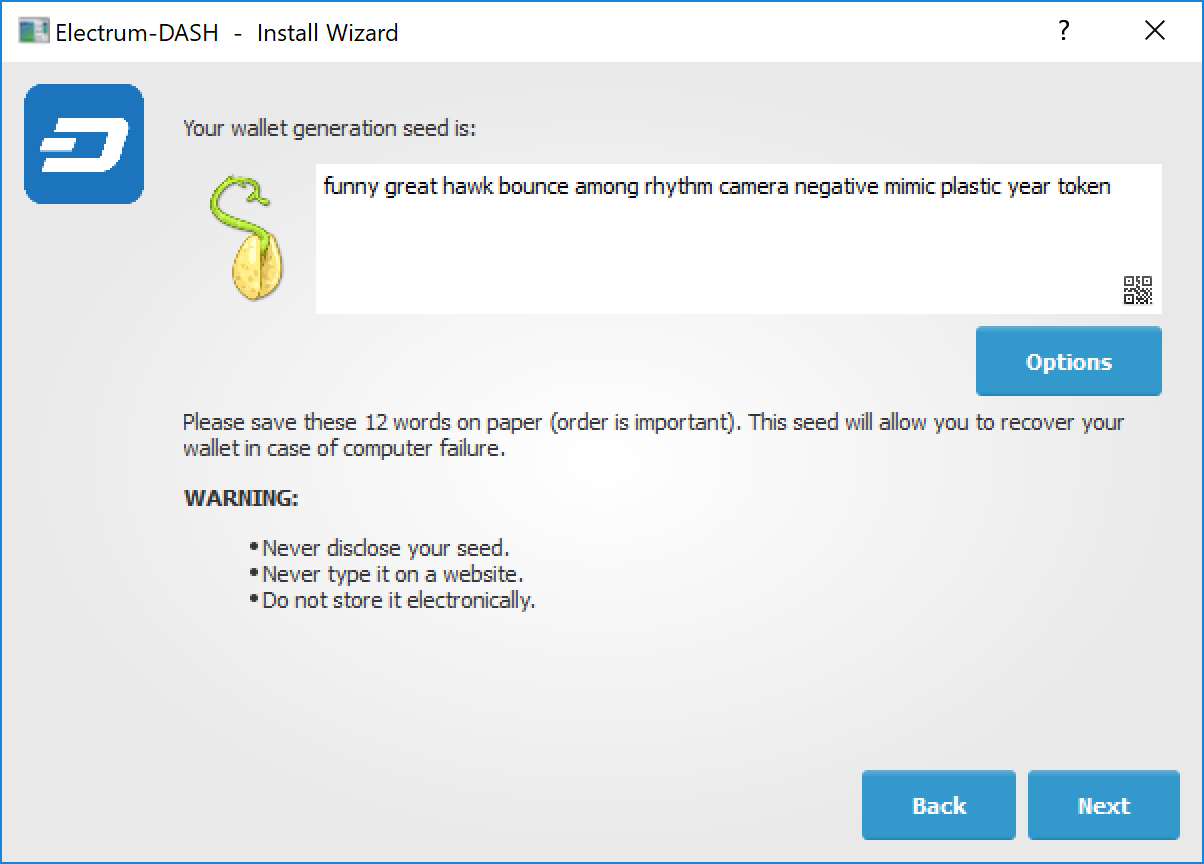 Electrum Dash will generate your wallet and display the recovery seed. Write this seed down, ideally on paper and not in an electronic format, and store it somewhere safe. This seed is the only way you can recover your wallet if you lose access for any reason. To make sure you have properly saved your seed, Electrum Dash will ask you to type it in as a confirmation. Type the words in the correct order and click Next to continue.