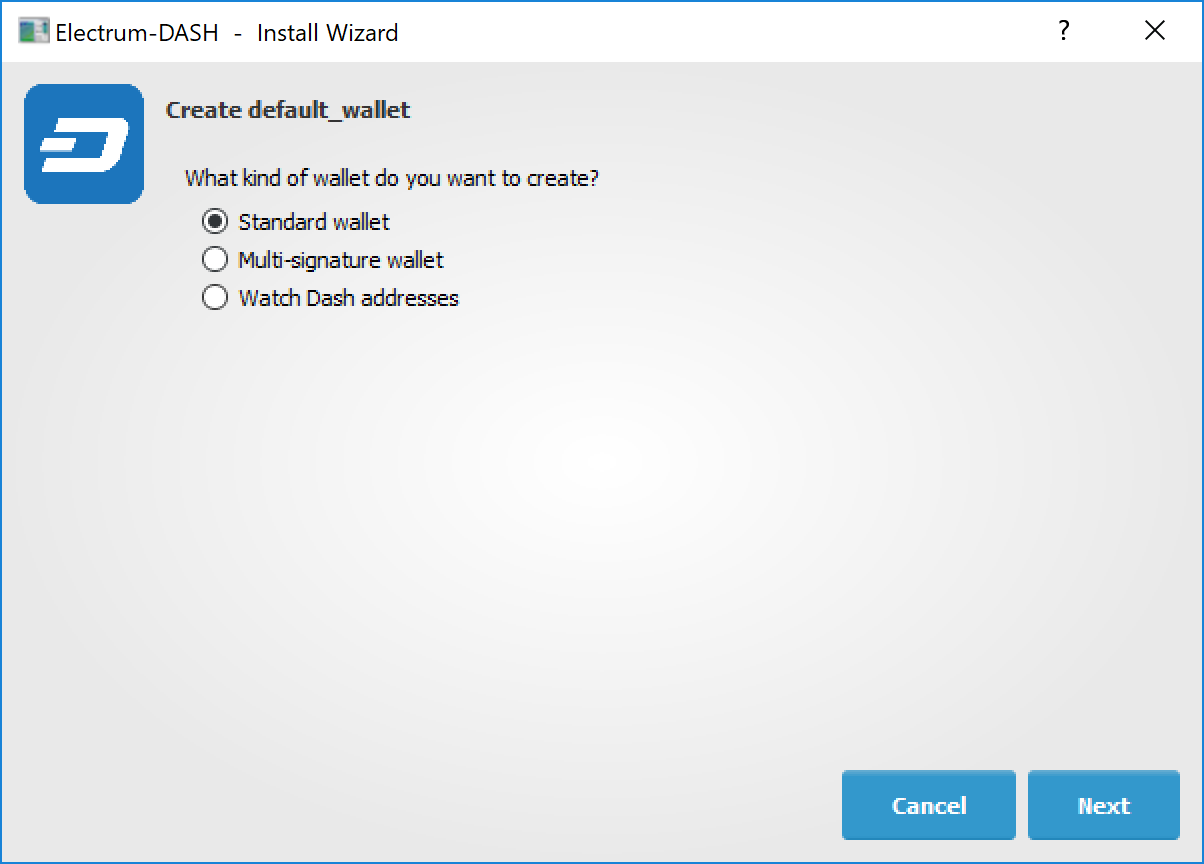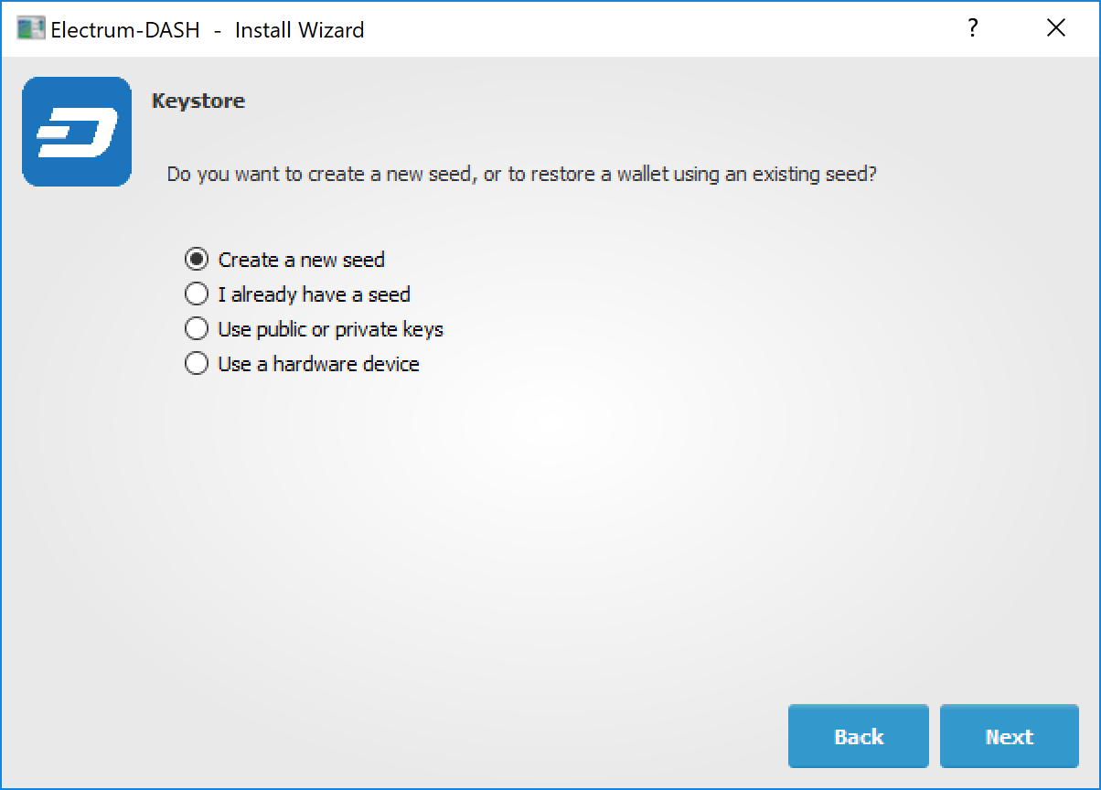 You will be asked what kind of wallet you want to create. Choose between Standard wallet, Multi-signature wallet and Watch Dash addresses. If you are unsure, select Standard wallet and click Next to continue. You will then be asked how you want to store/recover the seed. If stored safely, a seed can be used to restore a lost wallet on another computer. Choose between Create a new seed, I already have a seed, Use public or private keys or Use a hardware device. If you are using Electrum Dash for the first time and not restoring an existing wallet, choose Create a new seed and click Next to continue.